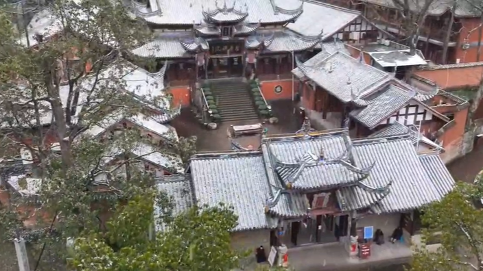 近日,重庆多地气温骤降,部分地区迎来降雪。大足石刻宝顶山景区圣寿寺雪花飘洒,寺院和石刻造像都“穿”上了白色纱衣,别有一番景致。