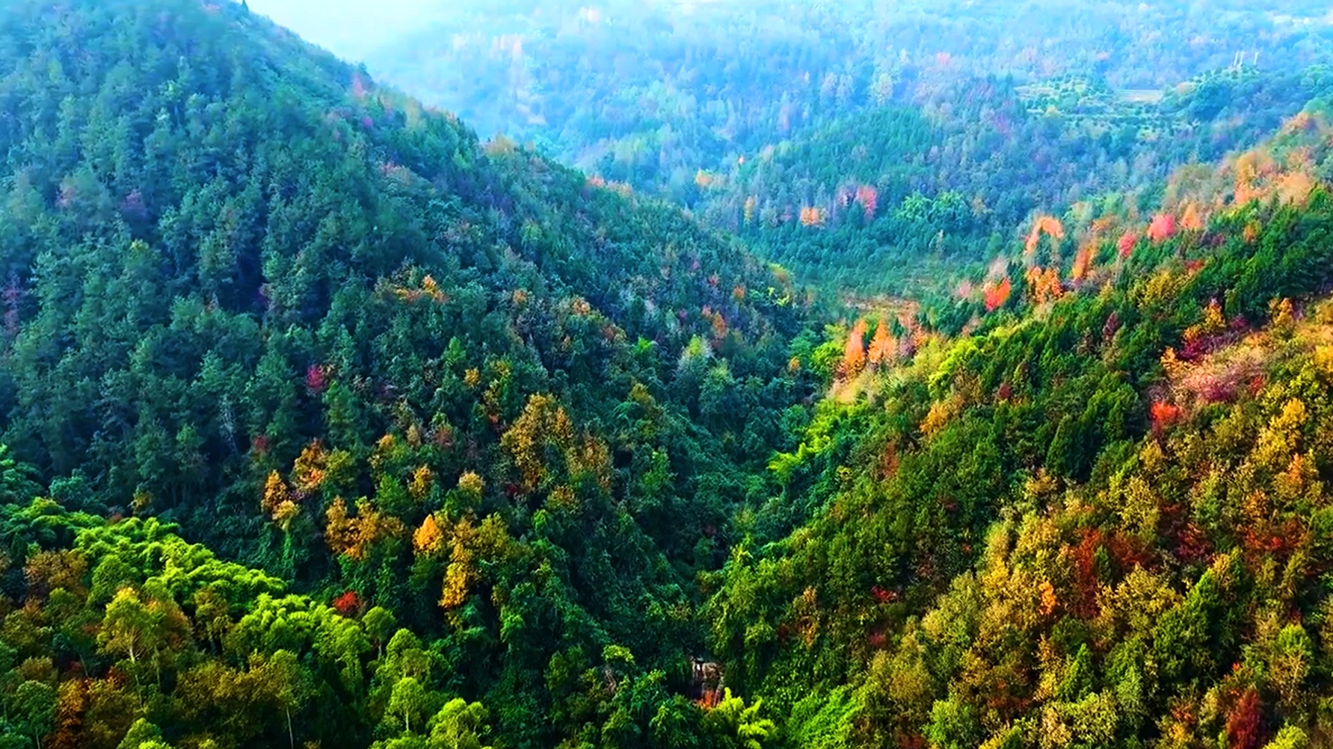 五彩如泼墨,七色抹脂胭。近日,忠县涂井乡漫山遍野层林尽染。从空中鸟瞰,橘红、橙黄、翠绿、浅蓝……各色彩林相互辉映,大地宛如一幅巨大无比的水彩画。