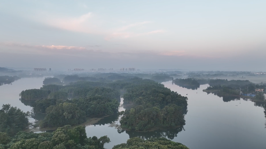 深秋时节的清晨,重庆市大足区的龙水湖碧波荡漾,薄雾缭绕,呈现出令人心旷神怡的别样景致。