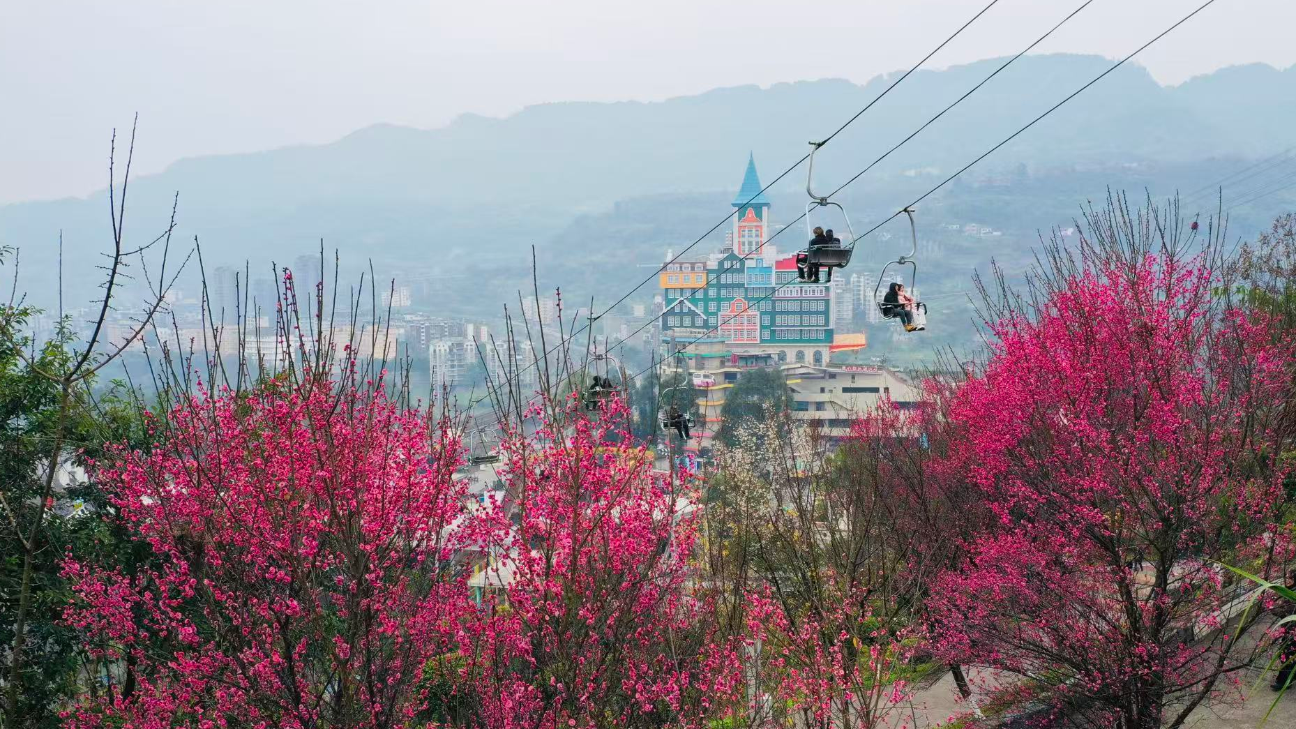 1月24日,时值“四九”寒天位于涪陵区的美心红酒小镇鸡公山游乐园内的红梅却顶寒绽放,殷红花瓣缀满枝头如簇簇丹霞,与索道1号线、美心彩色酒店及长江边欧式建筑相映成趣,一场“踏空寻梅”的暖冬文旅盛宴正热闹上演,让“淡季不淡”的冬日旅游市场持续升温。