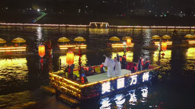 万州天仙湖龙船竹筏夜游目前正在试营业,2026年2月5日正式开放,竹筏装饰了油纸伞造型的暖黄灯带,和天仙湖的水面倒影、城市夜景交相辉映。有汉服歌舞、情景短剧,火壶表演、水上飞人等特技演出,光影效果拉满。