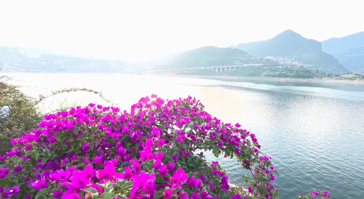 大宁河蜿蜒流淌,在巫山县城与长江相遇,在此处形成了一个面积达10余平方公里的湖泊,被称为大宁湖。在夏日的早晨,温暖的阳光从梨子坪高处投下,岸边的三角梅热烈盛开,大宁湖显得美丽多姿。