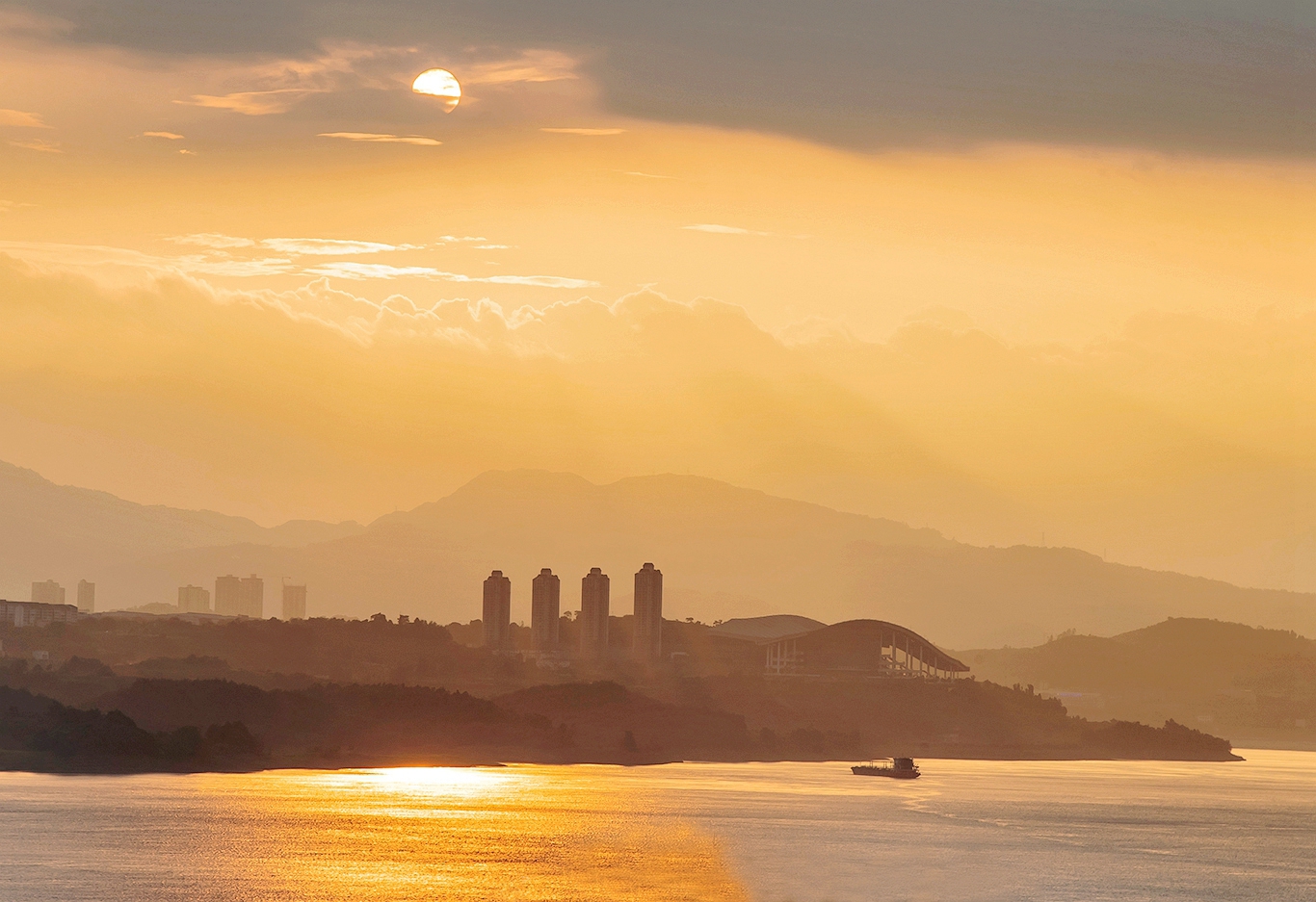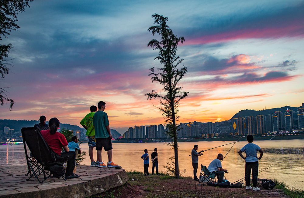 7月28日傍晚,在绚丽晚霞映射下,忠县城郊水域熠熠生辉、妩媚迷人,把白居易《暮江吟》中“一道残阳铺水中,半江瑟瑟半江红”的意境表现得淋漓尽致。