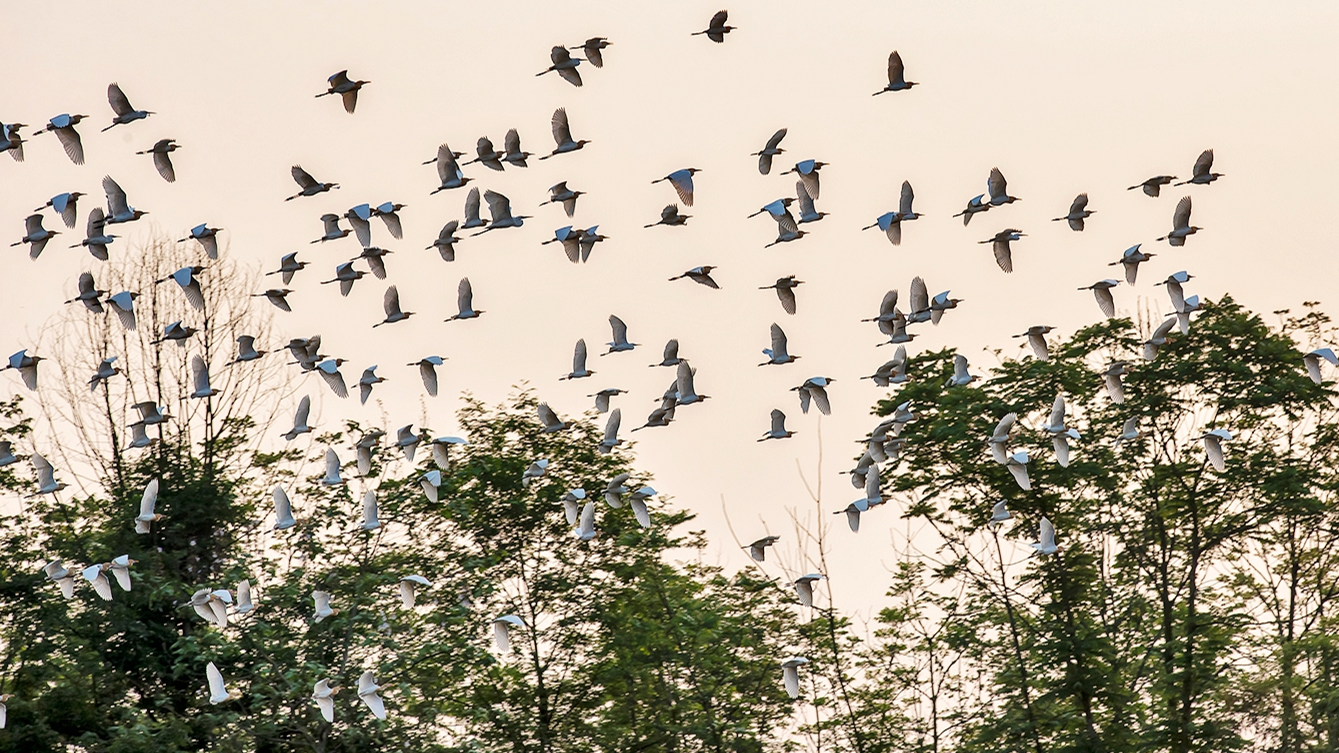 4月14日下午6时30分许,在忠县复兴镇凤凰村7组一个叫“刘家湾”的村落里,伴随“噗”的一声巨响,数百只白鹭集体起飞盘旋,把暮色下的村庄“染成”一片雪白,壮美场景令人叹为观止。