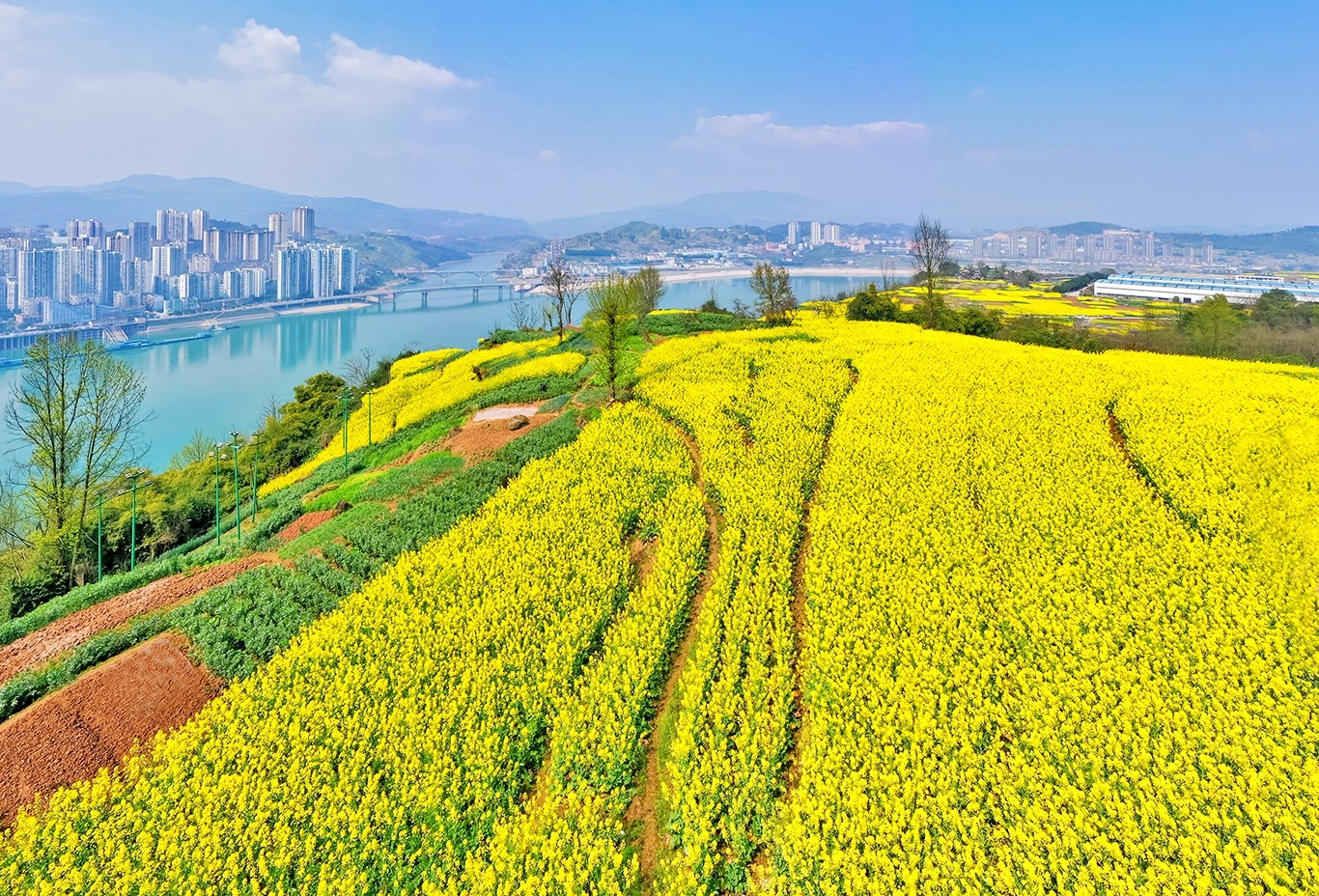 3月11日,位于重庆涪陵美心红酒小镇景区索道公园索道3号线下方的“盘山龙形梯田”油菜花一派金黄。当天,“上春山看村花”——美心红酒小镇第三届索道春天旅游节启幕,先后举行了龙王祈福、天女散花、春耕舞龙等民俗活动。据悉,此次活动由美心红酒小镇景区主办,蔺市街道社区文化服务中心协办。