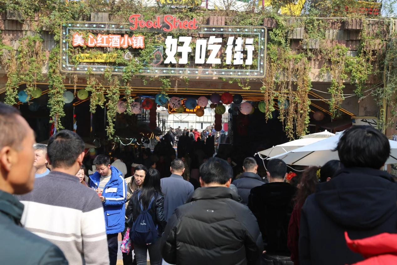 春节假期的前几天,重庆大部分地区天气晴好,市民出游热情高涨。位于重庆涪陵的美心红酒小镇景区在大年初三迎来龙年又一波人气高峰。除了游玩新景点与游乐项目吸引不少游客排队打卡外,景区内的新春集市也热闹非凡。