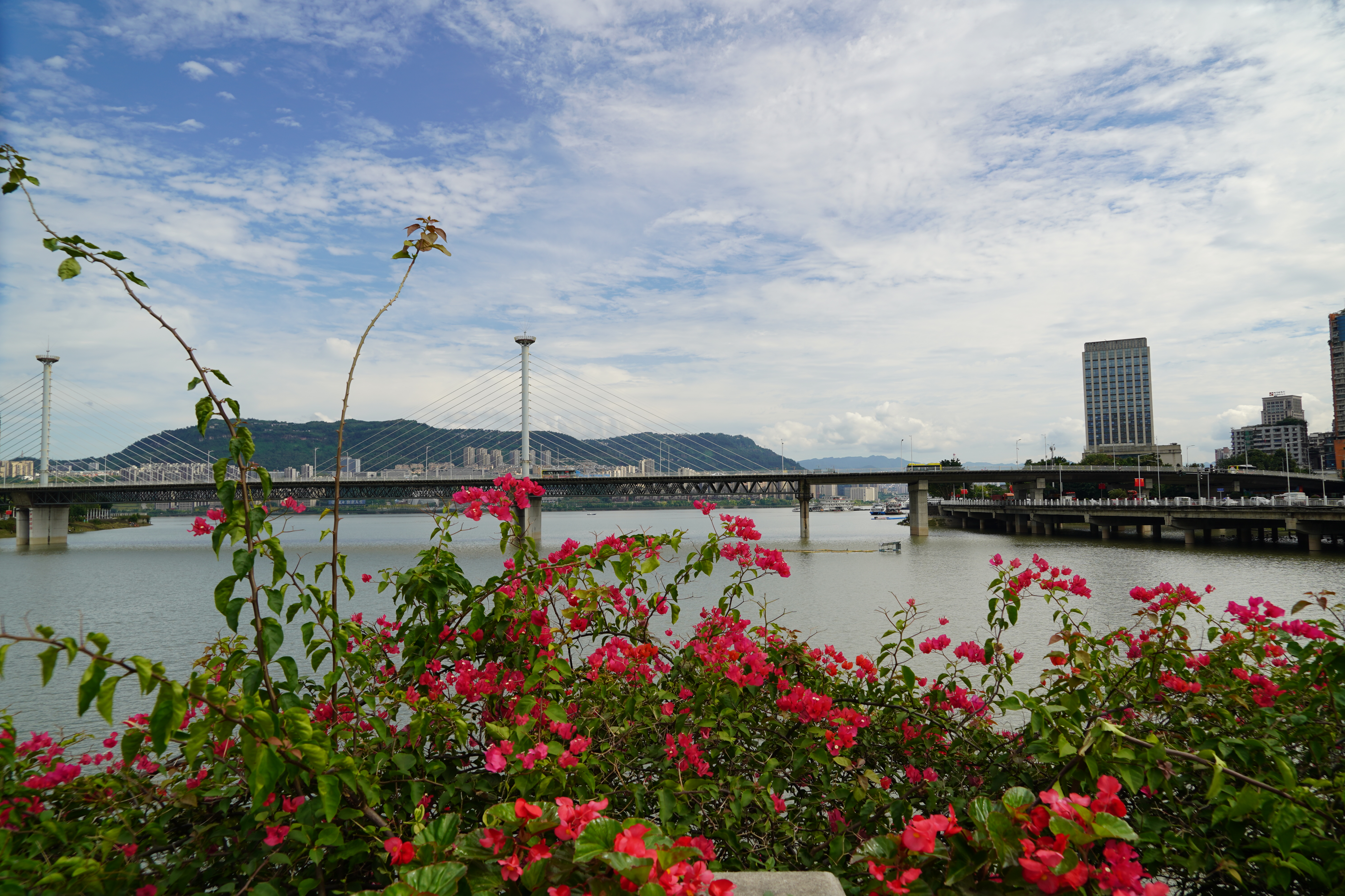 进入秋季,正值三峡水库水位即将到位,高峡平湖碧波荡漾,滨江地区三角梅花开艳丽,迎来了它们的“第二春”。
