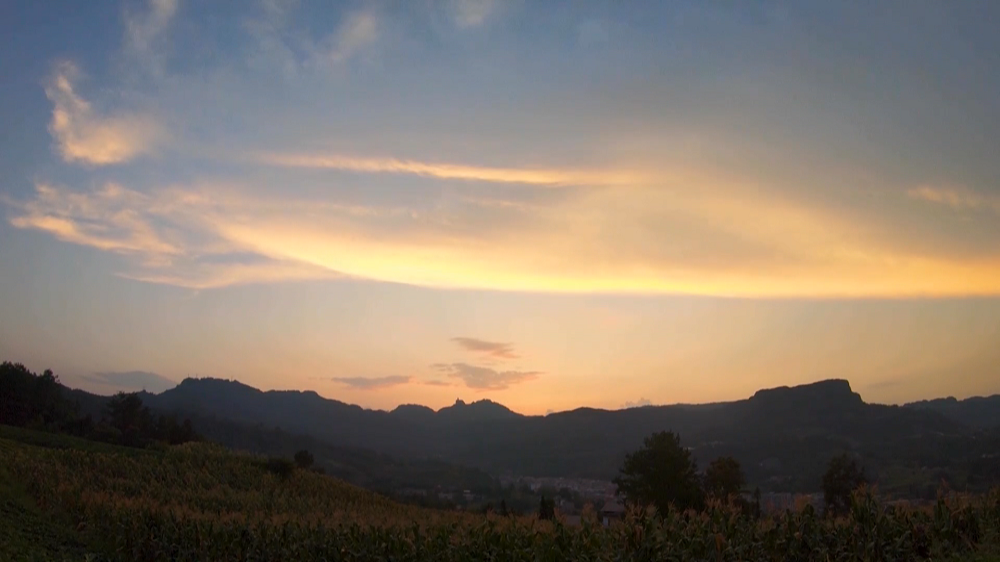 当太阳偏西,天边的云朵镀上了绚烂的色彩,山间的庄稼、农房变得凝重,农人们来到高地,乘凉、观景、闲聊,有一缕烟火,有一点温情。