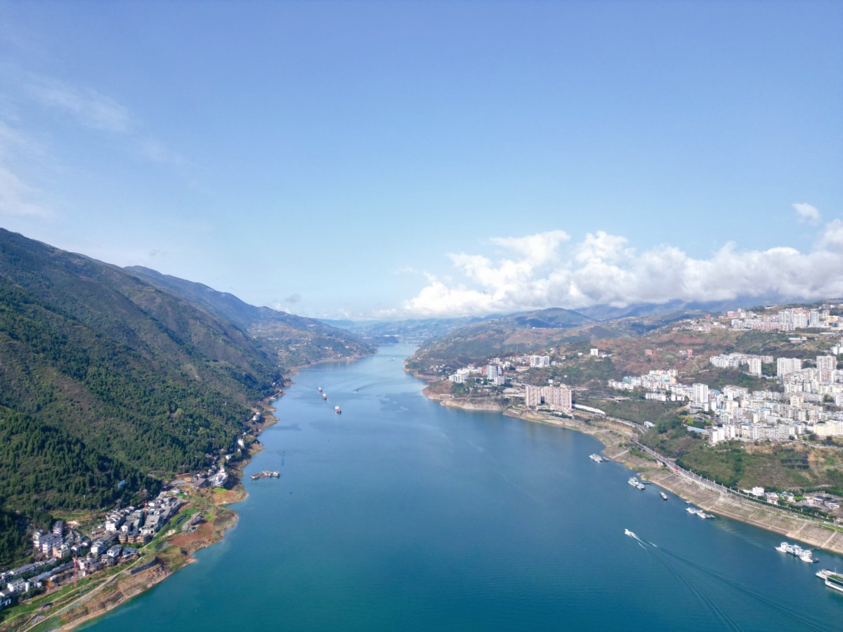 重庆巫山:雨后初晴 长江三峡美如画 4月6日,天空放晴,长江巫山段清澈湛蓝,江面上游轮川流不息,远处青山如黛, 白云在山脊上流淌,让人心旷神怡。从空中俯瞰,光影倒映明澈的峡江中,如碎金般的余晖点缀水面,动静相宜,让人陶醉。山、水、城、船交相辉映,绘就出一幅人与自然和谐的美丽画卷。