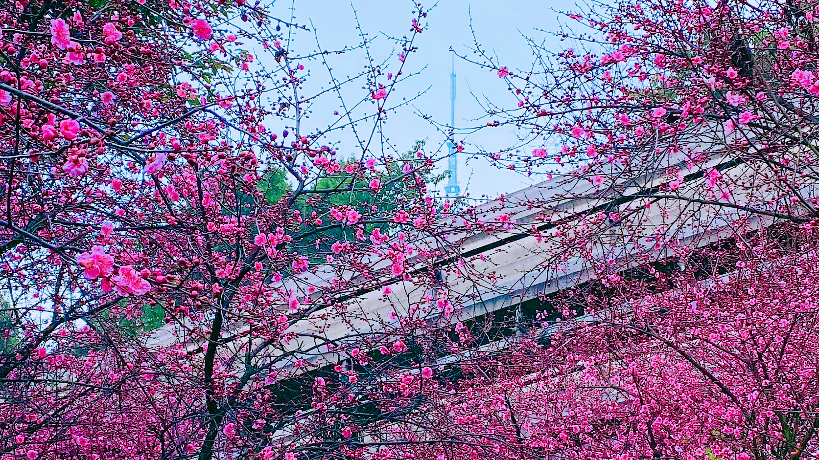 近日,万州城区的红梅花竞相绽放,为城市增添了浓浓春意。