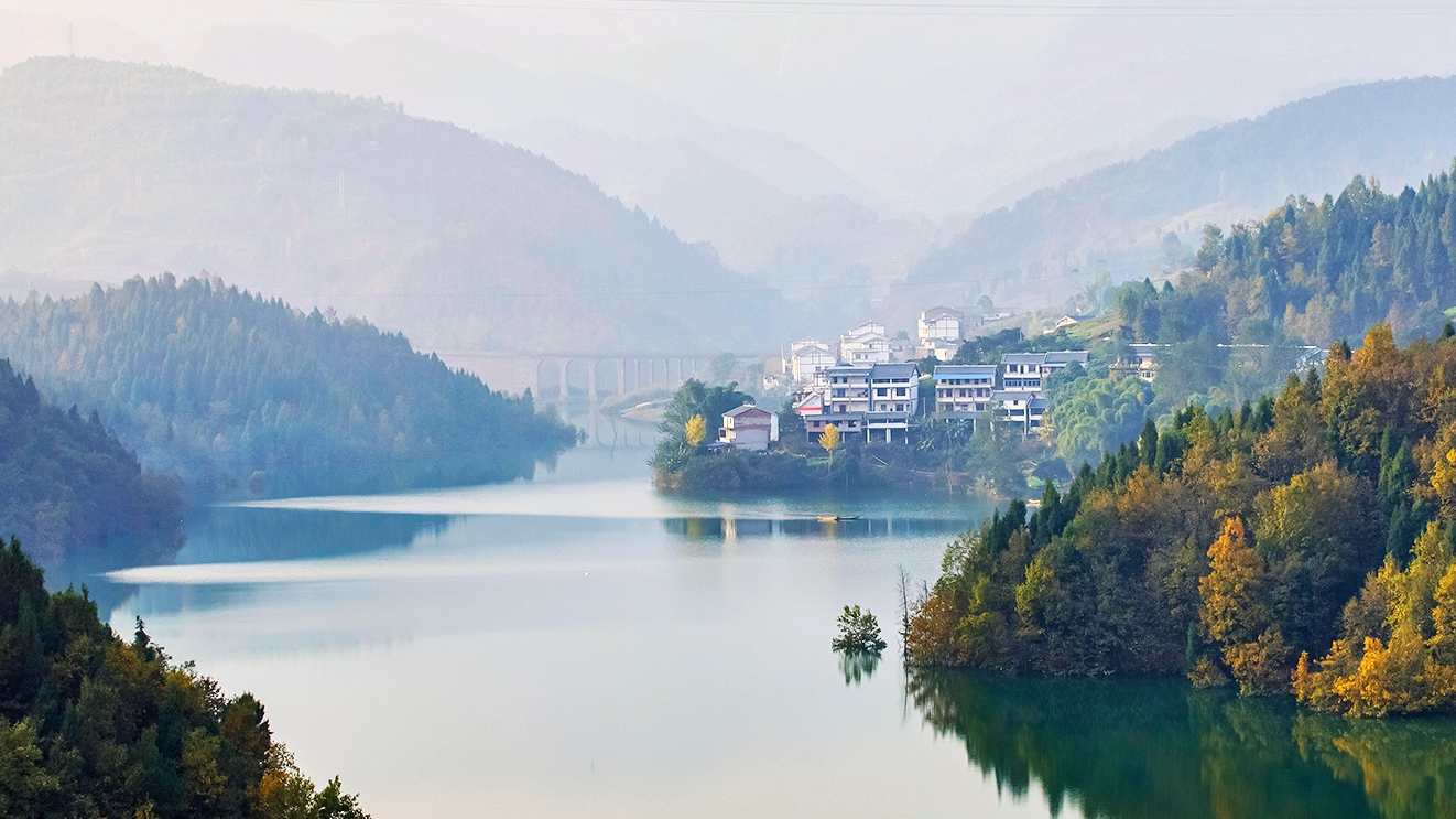 忠县移民新村:山水相拥 桥岛相连 碧水荡漾、植被葱郁、桥梁飞跃……从空中俯瞰地面,忠县白公街道九蟒社区山清水秀、桥岛相连,宛若一幅美轮美奂的生态画卷。