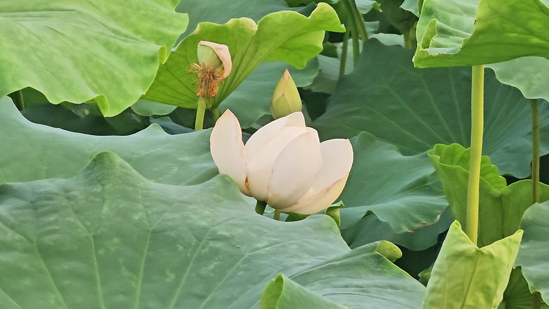 近日,在綦江区古南街道,白荷正次第舒展。有的敛瓣含香,有的初绽芳姿。相较于粉荷的浓艳,这绿盖叠叠间的白荷,更显清逸,自有一番遗世独立的美。