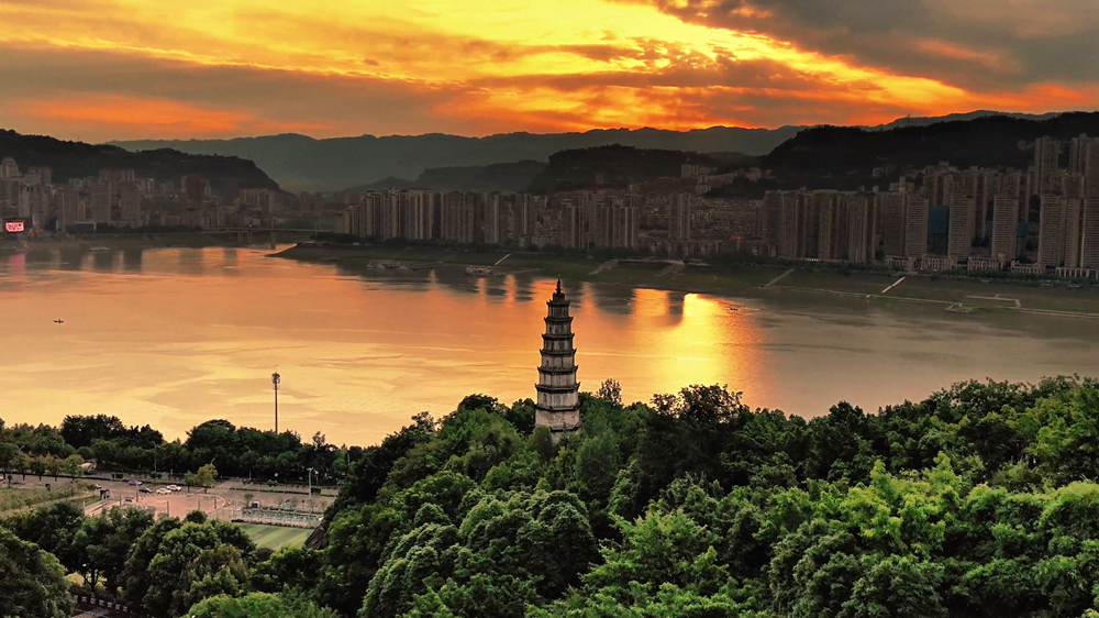 近日傍晚,万州回澜塔沐浴彩霞,残阳铺洒江面,勾勒绝美城市天际线 。