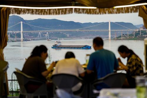 万州区十七码头江滩夜市,市民吹江风、品美食、赏江景。长江水位下降,江畔的夜市热闹起来,充满烟火气。
