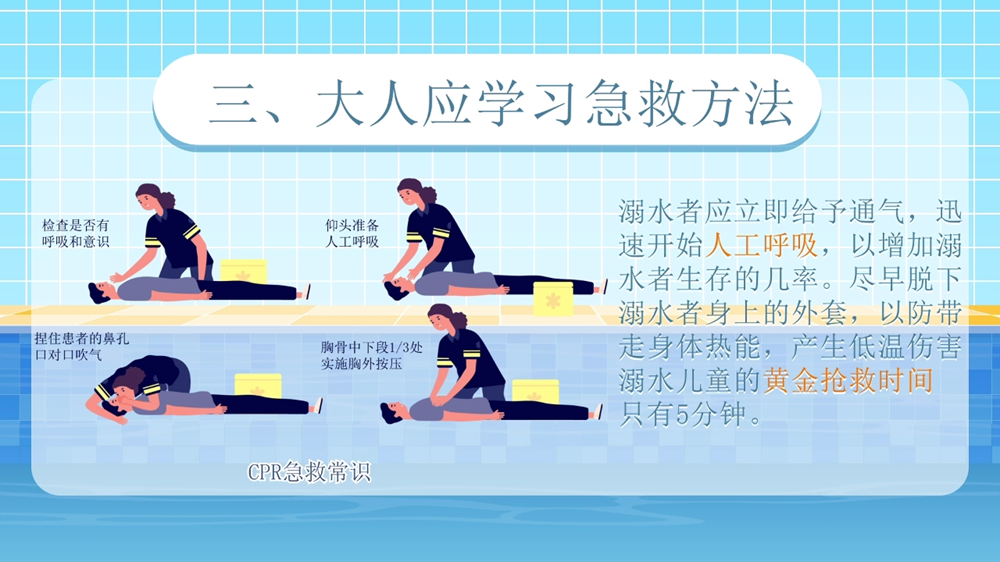防孩子溺水,必须时刻有效看护,预先观看有关视频,起到预警作用,监护人应该学习一些救护技能。