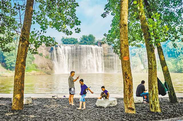 8月27日,北碚区歇马街道大磨滩湿地公园内,不少游客拿着手机、相机在拍照留念。大磨滩湿地公园今年5月开园,短短3个多月里迎来了50多万名游客,公园内的大磨滩瀑布更是成为游人争相打卡的新晋“网红”景点。
