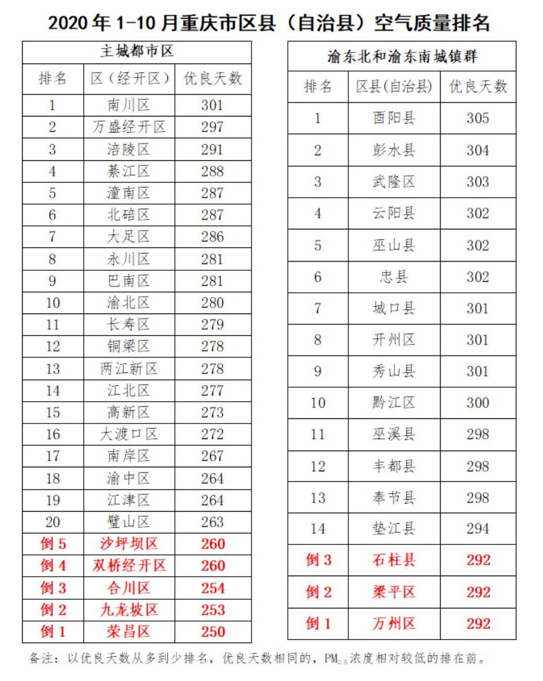 11月11日,重庆市生态环境局公布了2020年10月和1-10月重庆市及区县(自治县)空气质量(优良天数)排名情况。