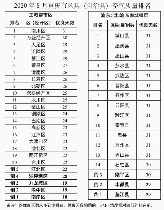 9月8日,按照《重庆市大气污染防治条例》第22条规定,市生态环境局公布了今年8月和1-8月重庆市空气质量排名通报,数据显示,8月,重庆市空气质量优良天数为23天(同比增加5天),其中9天为优、14天为良。