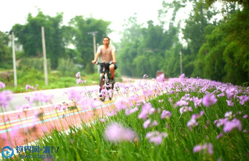 进入六月,重庆市荣昌区濑溪河体育公园马拉松赛道两旁,各种时令鲜花盛开,众多市民闻香而来,健身心、赏美景。图为骑车市民经过盛开的木春菊。