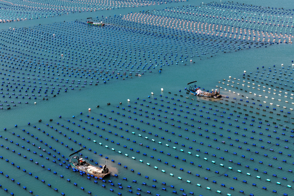 近日,福建省福州市连江县筱埕镇海域的海洋牧场呈现出一派繁忙的秋日海上耕作景象。