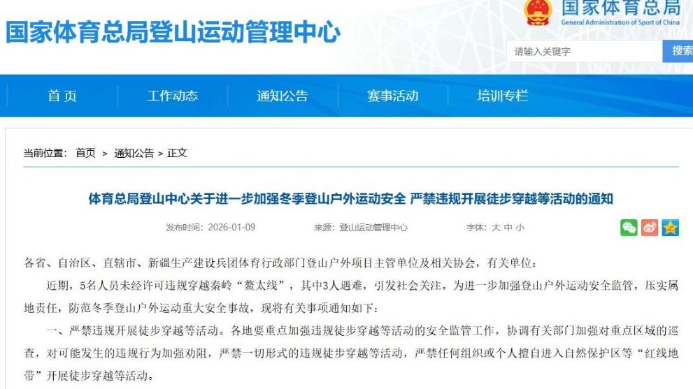 9日,国家体育总局登山运动管理中心发布通知,强调进一步加强冬季登山户外运动安全,严禁违规开展徒步穿越等活动。