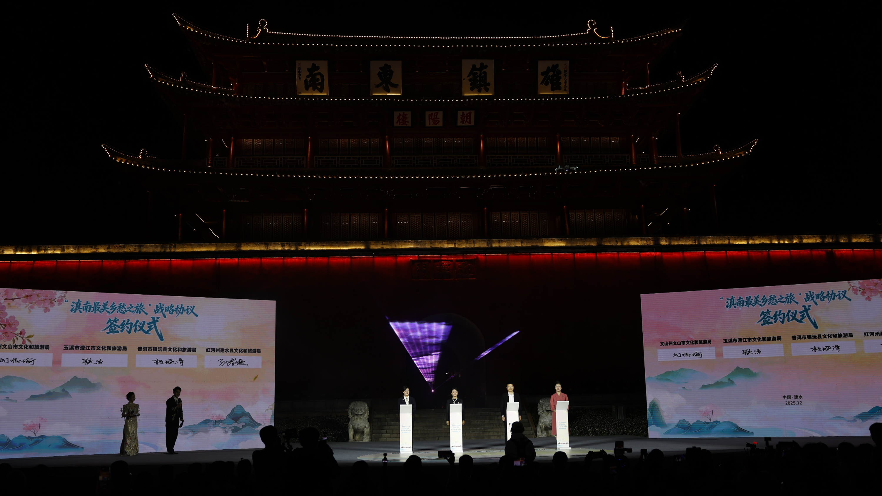 云南省红河哈尼族彝族自治州建水县、玉溪市下辖的澄江市、文山壮族苗族自治州文山市、普洱市镇沅县12月21日晚在建水古城签订滇南最美乡愁之旅战略合作协议,四地将共同打造跨区域文旅品牌。
