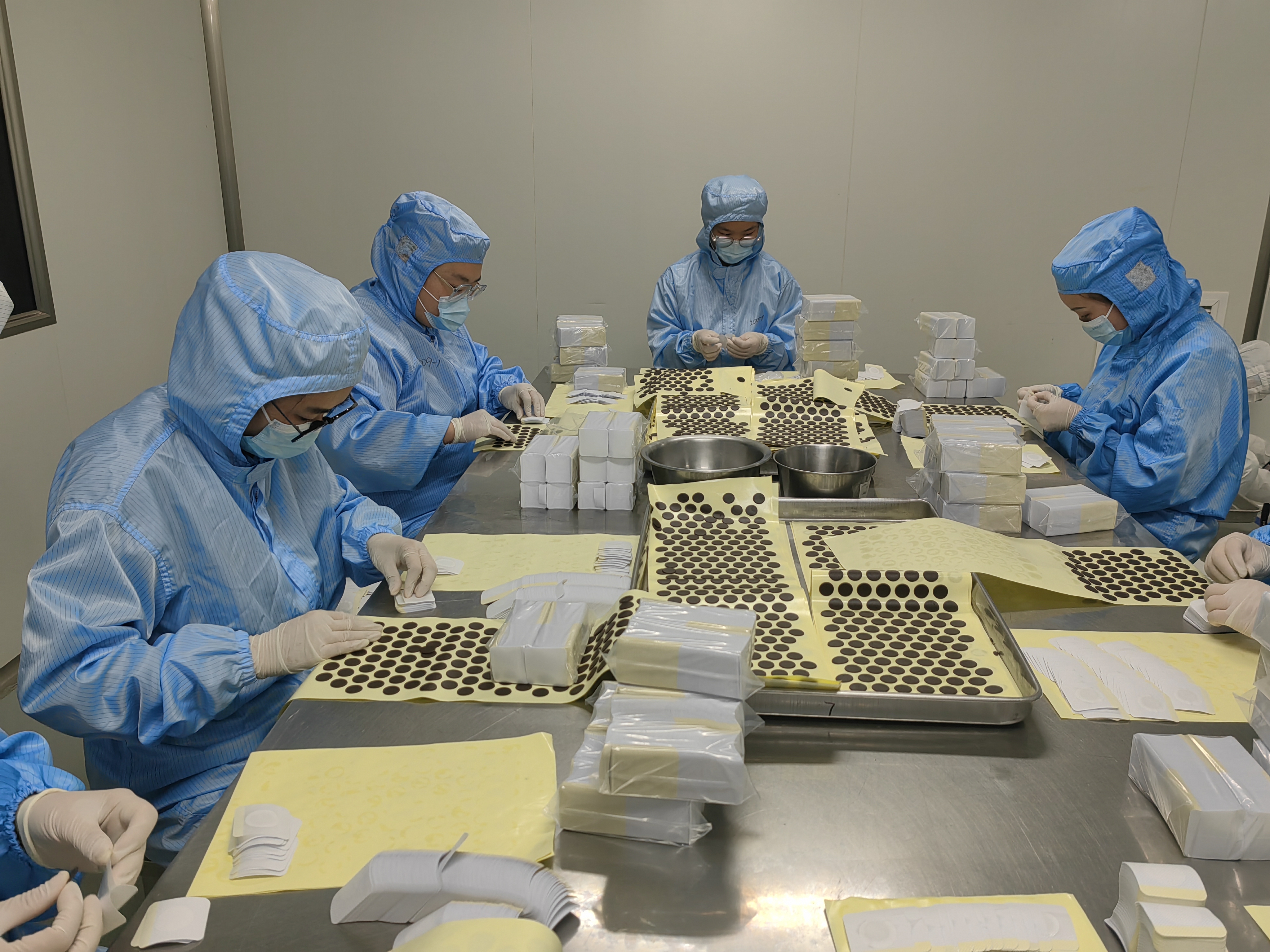 穿上鞋套和洁净服、戴上口罩和帽子走进车间,眼前,药师们正在制作“温阳化痰穴贴”。这种穴贴已连续多年作为北京市“冬病夏治三伏贴”专项工作指定用药,供全市700余家医疗机构调剂使用。