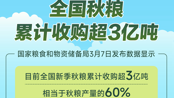 国家粮食和物资储备局3月7日发布数据显示,目前全国新季秋粮累计收购超3亿吨,相当于秋粮产量的60%,秋粮旺季收购“大头”落地。