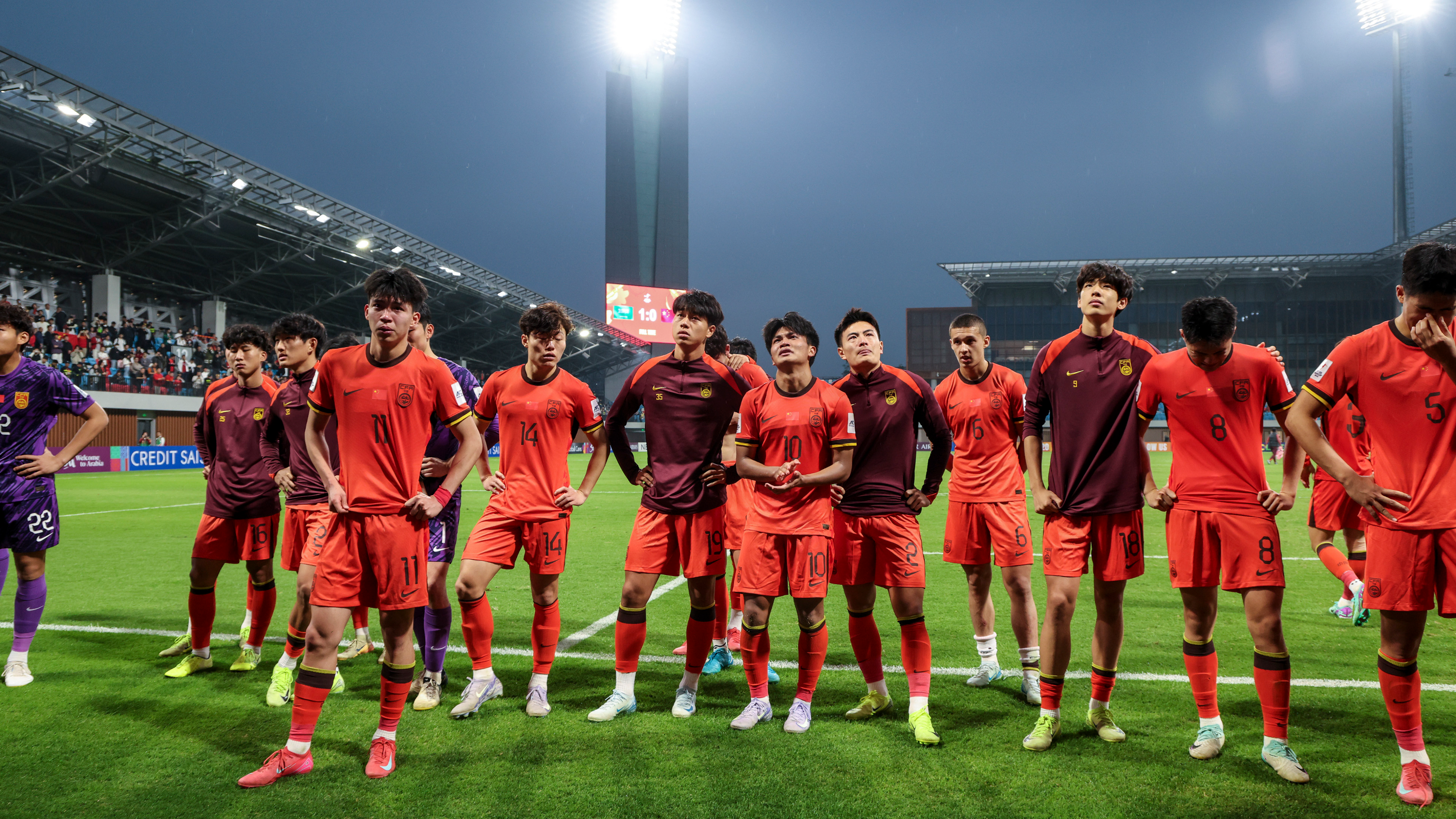 或许是一种巧合,就在终场哨响后几分钟,天空突然下起了淅沥小雨,给深圳的这个傍晚增添了几分寒意。在雨中,中国球迷们哭了,中国U20男足的球员也哭了,王钰栋倒在地上迟迟不愿起身,毛伟杰掩面啜泣直不起腰来,雨水、汗水、泪水交织在一起,宣泄着国青将士们的痛苦与不甘。