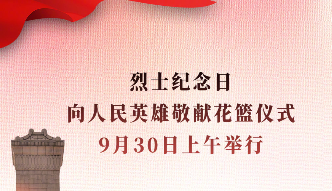 烈士纪念日向人民英雄敬献花篮仪式9月30日上午举行 习近平等党和国家领导人将出席