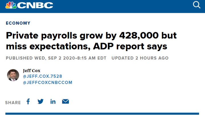当地时间9月2日,美国自动数据处理公司(ADP)发布数据显示,8月美国私营部门就业人数增加42.8万人,大幅低于95万~117万人的市场预期。