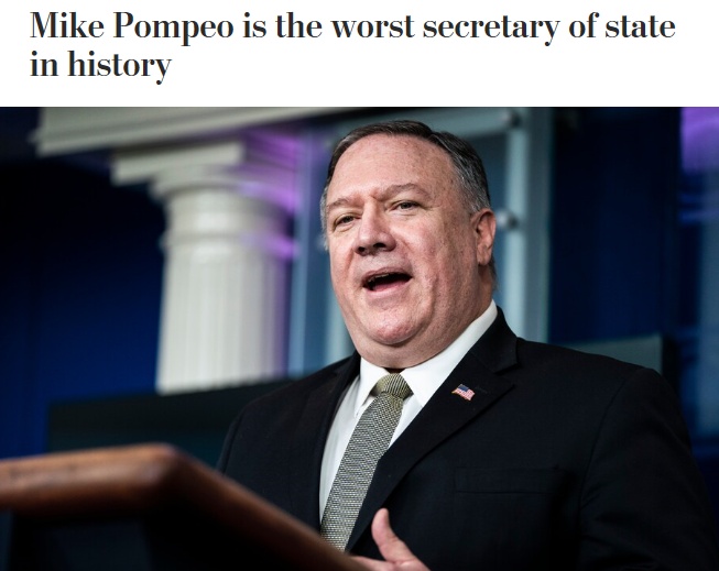 “史上最差国务卿之一”是美国《华盛顿邮报》今年3月30日给予蓬佩奥的头衔,以抨击他在疫情期间毫无建树。5个月之后的8月31日,这家美媒再次以《蓬佩奥是史上最差国务卿》为题列举其荒唐言论和无脑行为,称蓬佩奥将美国外交政策推入死胡同,让美国受孤立程度达到历史顶峰。