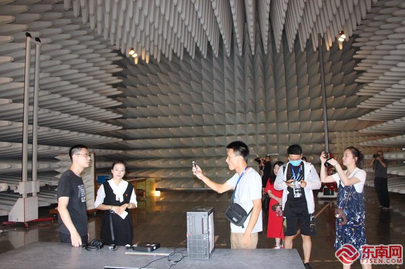 在一个“暗室”内,墙壁和屋顶上都布满了锥形的吸波材料,技术工程师钟华彧正在做电子产品的电磁兼容测试。