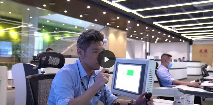 一位驾驶员坐在空调房里,盯着屏幕画面,操作着操控台上的按钮和手柄;屏幕上显示,几公里外的码头上,塔吊准确无误地吊起、卸下货车上的集装箱……