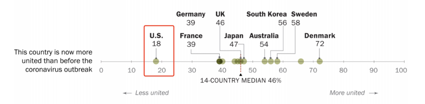 27日,美国民调机构皮尤研究中心(Pew Research Center)公布的一项调查结果显示,在受访的14个发达国家中,美国民众对自己国家政府应对新冠疫情的认同度排名垫底,未超过半数。
