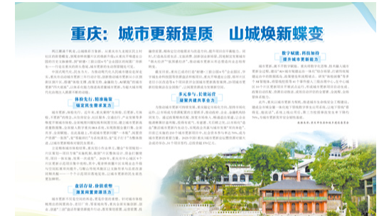 两江潮涌千帆竞,山城焕彩万象新。从重庆市九龙坡区民主村社区的街巷蝶变,到观音桥商圈片区的焕新升级;从重庆开埠遗址公园的历史文脉赓续,到“耐德·三狼公园6号”企业园区的闲置厂房新生……行走在重庆的街头巷尾,城市更新的生动图景随处可见。