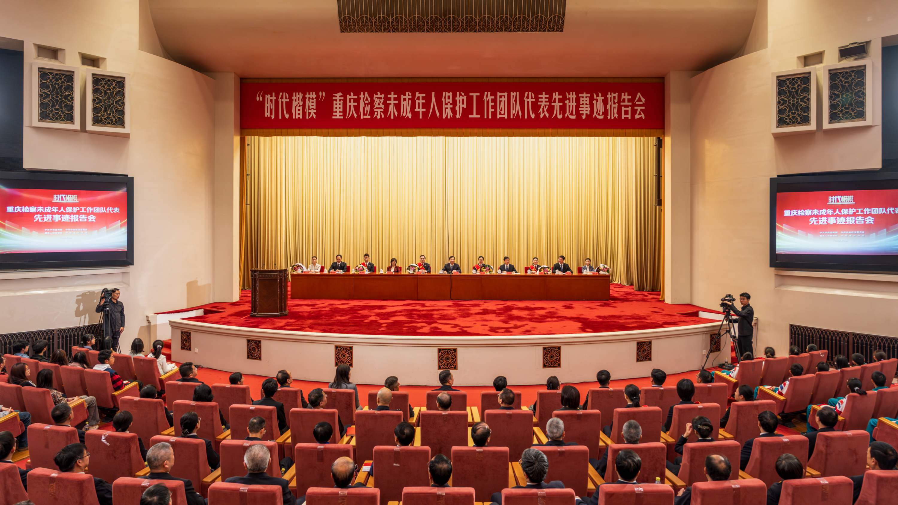 11月10日,由中央宣传部、中央政法委、最高人民检察院、重庆市委联合举办的“时代楷模”重庆检察未成年人保护工作团队代表先进事迹报告会在北京人民大会堂举行。来自中央和国家有关部门负责同志,政法系统各单位干警、首都大中小学生、部分全国人大代表和全国政协委员、媒体代表等700余人参加报告会。