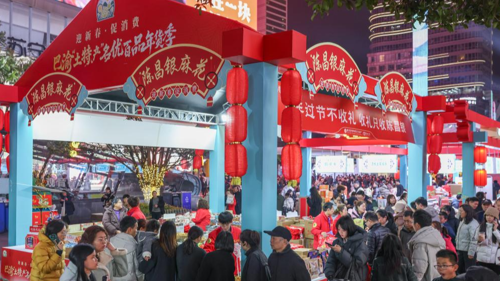 2月1日晚,重庆市两江新区观音桥步行街,市民在现场选购巴渝“土特产”。