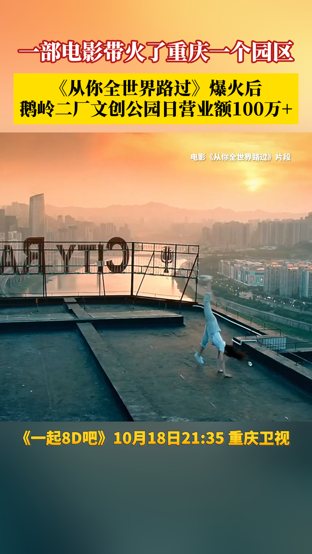 一部电影带火了重庆一个园区!电影《从你全世界路过》爆火后,鹅岭二厂文创公园日营业额100万+,节假日每天人流量最高时达8万人!因为电影,鹅岭二厂成为全国年轻人打卡的“香饽饽”!重庆广电集团(总台)台网融合类城市解码节目——《一起8D吧》首期10月18日精彩播出!