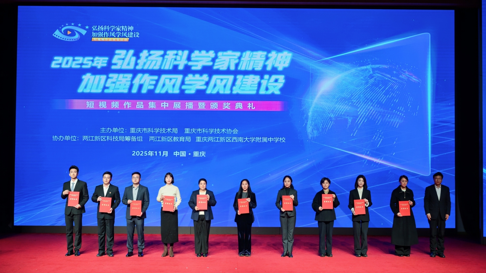 11月28日,由重庆市科学技术局、重庆市科学技术协会联合主办的2025年“弘扬科学家精神,加强作风学风建设”短视频作品征集活动集中展播暨颁奖典礼在重庆两江新区西南大学附属中学校举行。
