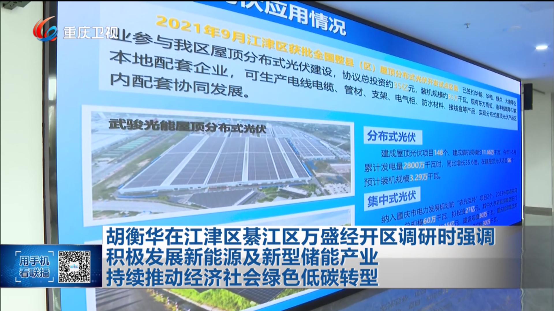 胡衡华:积极发展新能源及新型储能产业 持续推动经济社会绿色低碳转型 7月9日至10日,市委副书记、市长胡衡华在江津区、綦江区、万盛经开区调研时强调,要深入学习贯彻习近平总书记视察重庆重要讲话重要指示精神,按照市委、市政府工作安排,抢抓国家战略腹地建设等重大战略机遇,积极发展新能源及新型储能产业,为现代化新重庆建设提供安全可靠的能源保障,持续推动经济社会绿色低碳转型。