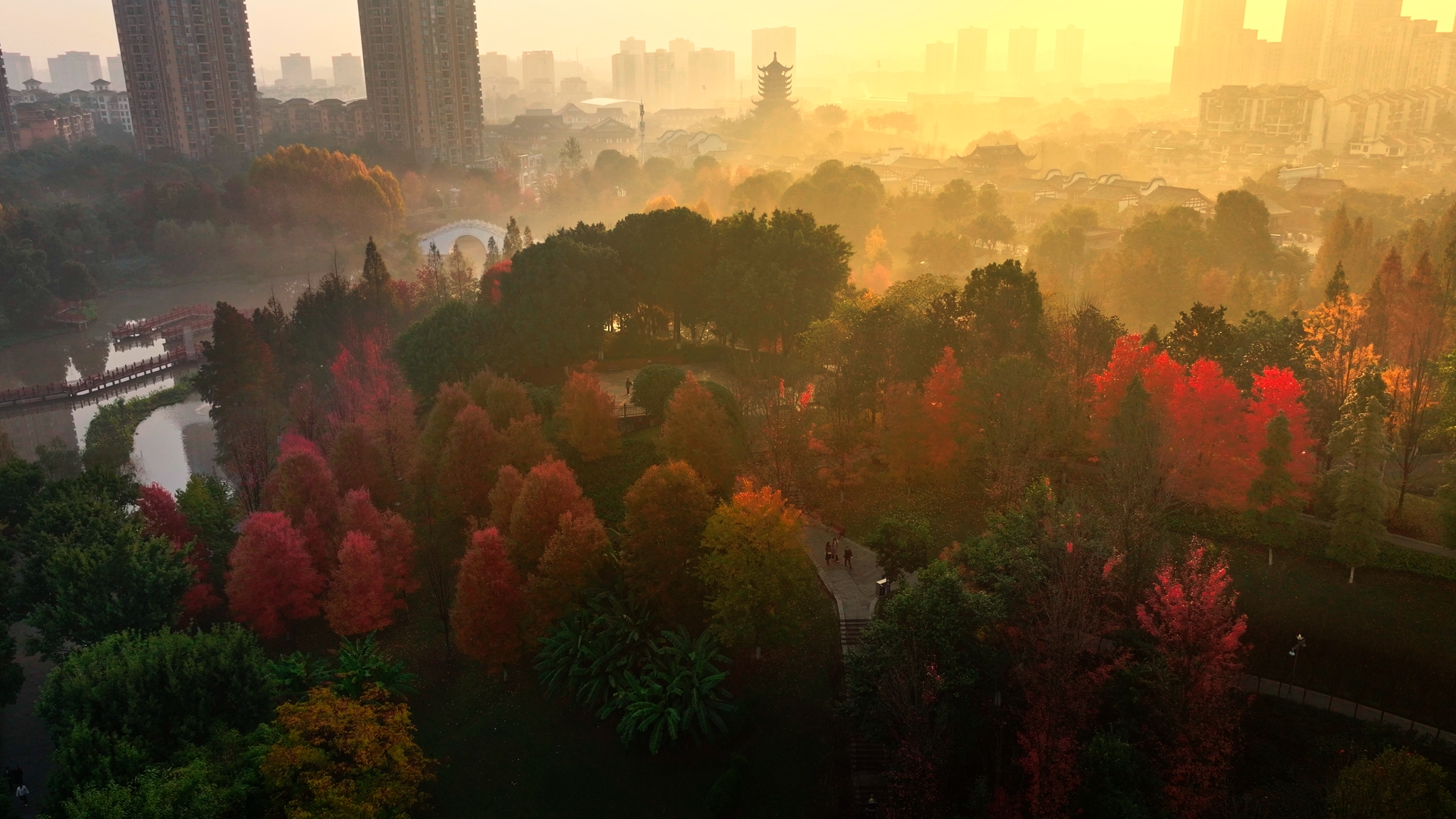 重庆铜梁:晨雾漫公园 晨光绘美景