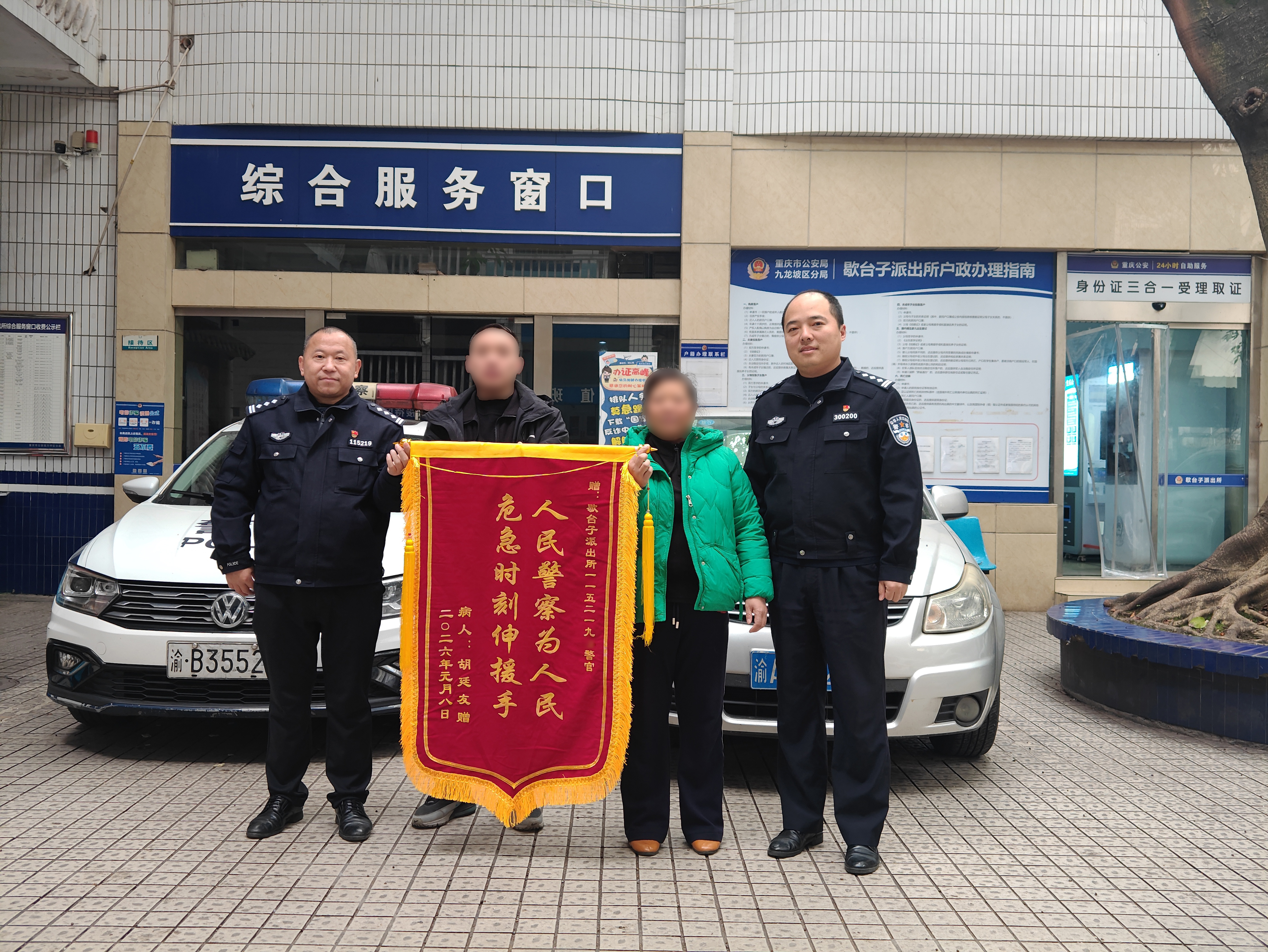 不久前,重庆市公安局九龙坡区分局歇台子派出所民警熊智民收到一个从医院传来的好消息:被他紧急救助的患病市民胡阿姨康复情况良好。更让他意外的是,几天后,胡阿姨一家带着一面锦旗来到派出所,锦旗上赫然写着“感谢歇台子派出所一一五二一九警官”,由于事发突然,胡阿姨没来得及问熊智民的名字,但那个警号深深刻在胡阿姨脑海中 。