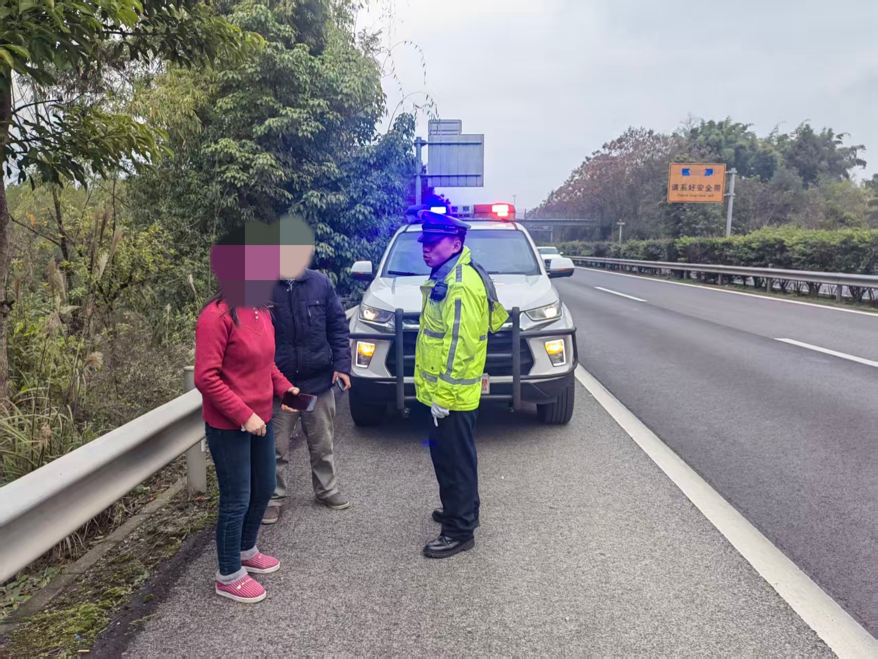 近日,重庆市公安局交通管理总队高速公路第四支队忠县大队接到报警,称G50沪渝高速永丰往白石方向有行人在应急车道内行走,情况危险。民警苟江、辅警杜康立即驱车前往现场,沿途细致搜寻,最终在永丰互通附近发现两名老人。