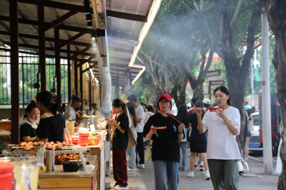 灯光璀璨、人流如织,烧烤摊升腾的烟火气、手工艺品的叫卖声、孩童的欢笑声交织。近日,记者夜幕下走进綦江区通惠大道新兴青春集市,一幅热闹的市井画卷扑面而来。在这繁忙喧嚣之中,一些悄然发生的变化更值得关注:雨棚升级了,路灯更亮了,环境整洁了,还多了公共用餐区……
