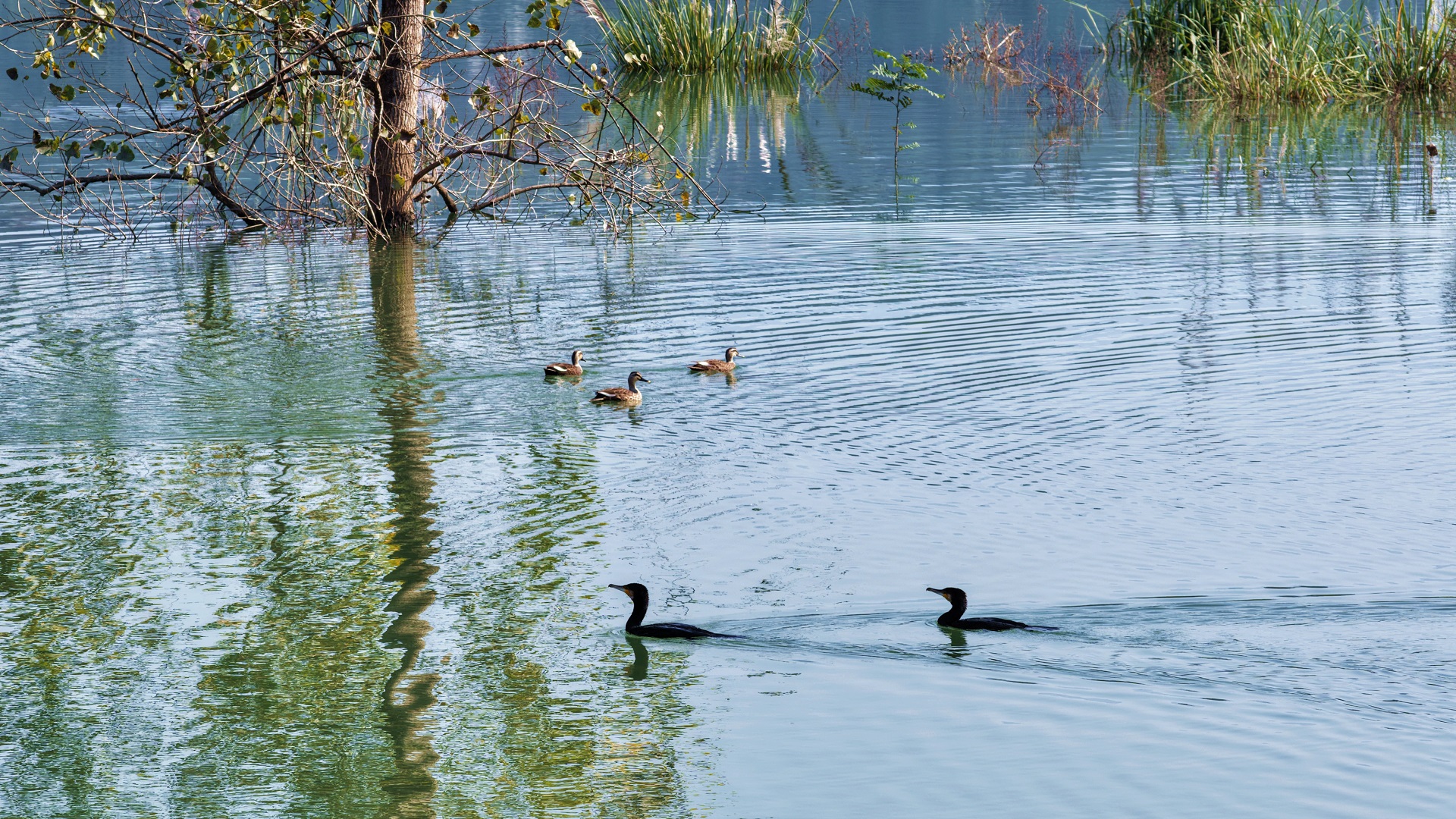 鱼翔浅底,候鸟戏水。近段时间,三峡水库蓄水至175米以来,长江支流重庆市忠县东溪河河水满盈,白鹭、鸬鹚、斑嘴鸭、绿头鸭等水鸟悠然栖居,好一幅生岁月静好的自然生态画卷。