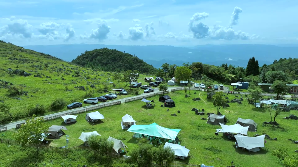 位于重庆市石柱县的千野草场,绿草如毡,帐篷星罗,远处山峦、蓝天与白云相映,是亲近自然、露营休闲的绝佳去处。