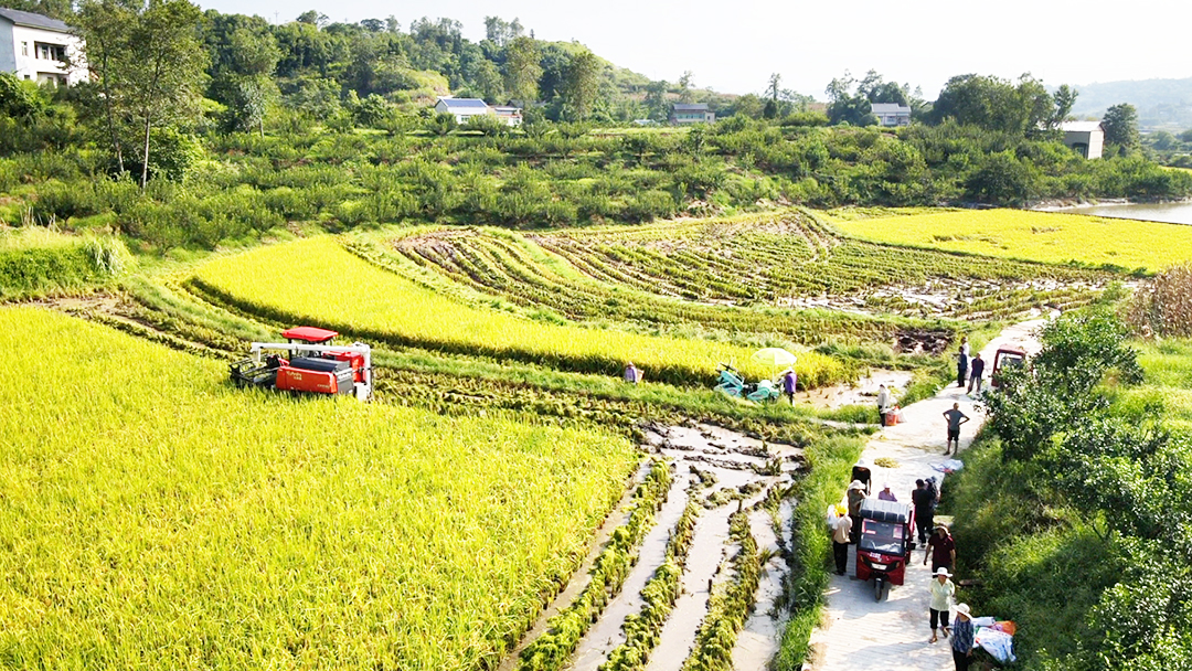 在綦江区石角镇新民村,广袤田畴,穗头涌动,收割机穿梭在金灿灿的稻浪间。伴随着机器的轰鸣声,割稻、脱粒、卸谷一气呵成,现场一派繁忙景象。