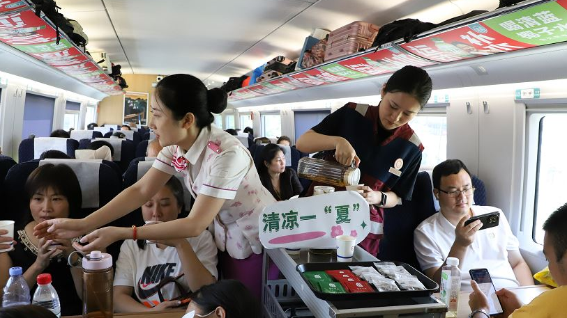 盛夏暑运 “清凉驿站”为旅客送清凉 盛夏暑运正酣,全国多地持续高温。7月31日,重庆西开往成都东的G2234次列车上暖意融融——重庆客运段联合重庆铁路疾控所医师,共同开展“清凉驿站 健康同行”防暑科普活动。乘务员与疾控所医师携手,将实用的高温防护知识和贴心关怀,化作旅客夏日旅途中的“降温神器”。