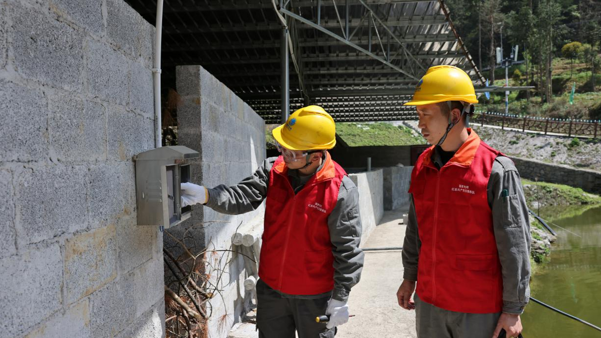 4月8日,国网重庆彭水供电公司桑拓供电所员工朱光荣和谢建波驱车前往桐楼乡普子村的“智慧渔场”,定期为养殖场排查线路隐患,助力乡村产业发展。